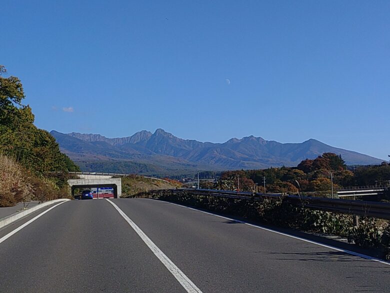 早速ですが今日の八ヶ岳。 この道は3年前に開通した蓼科から白樺湖に通じるバイパスです。 快晴の秋晴れ。 現場廻りも気持ち