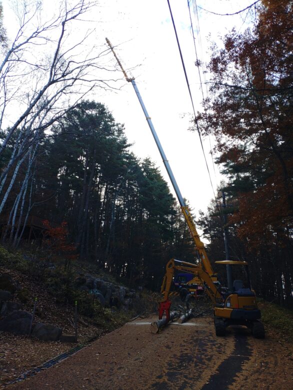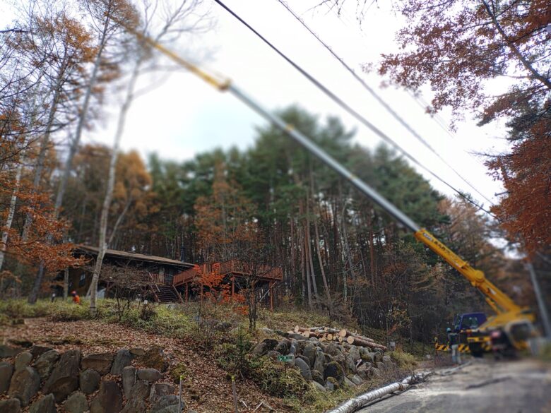 いつもの大型クレーンを使用した伐採風景です。(何故かチョットピンボケ。)