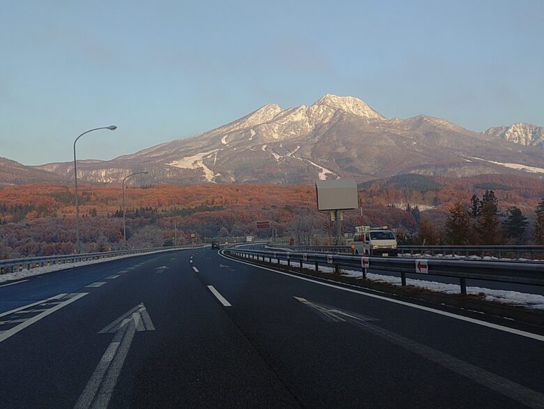 中腹に見えるのが妙高杉ノ原スキー場、ゲレンデにも積雪が見えます。