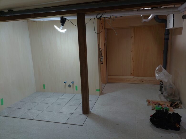水場スペース(タイルスペースは洗面スペースになります。)にタイルが貼られ。