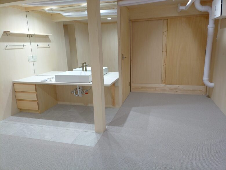 水廻りは汚れの心配もあり、絨毯ではなく、タイルをと、施主の希望で施工。