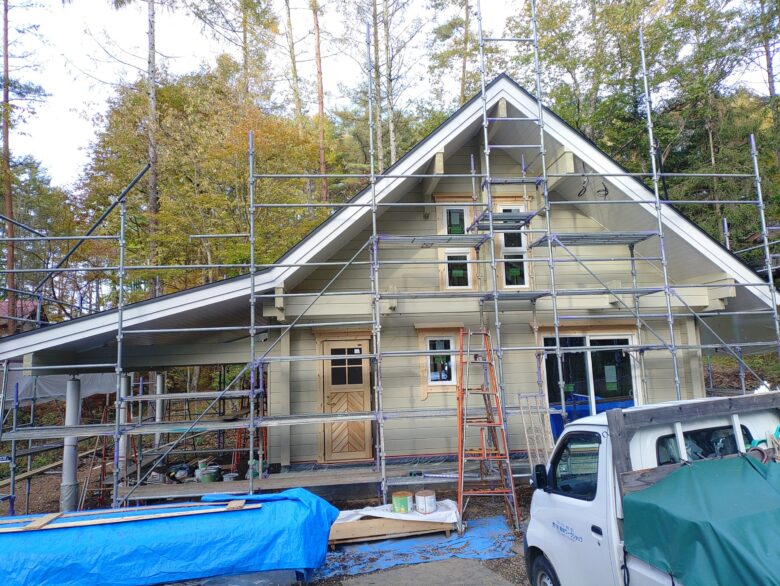 現場は外壁塗装工事進行中。