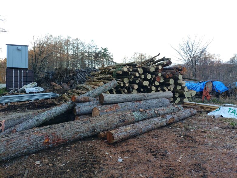今日は昨日の三井の森H邸新築工事の伐採工事のまとめ。 昨日伐採した木材を工場の置き場に運び、現場の片付け。 現場から工場