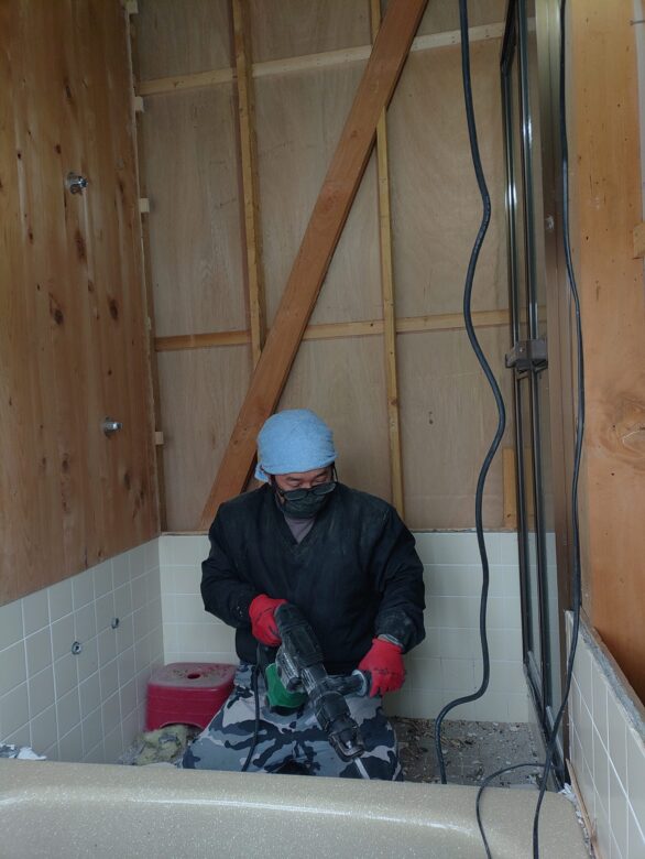 電動ハンマードリルでの既存浴室の解体風景。