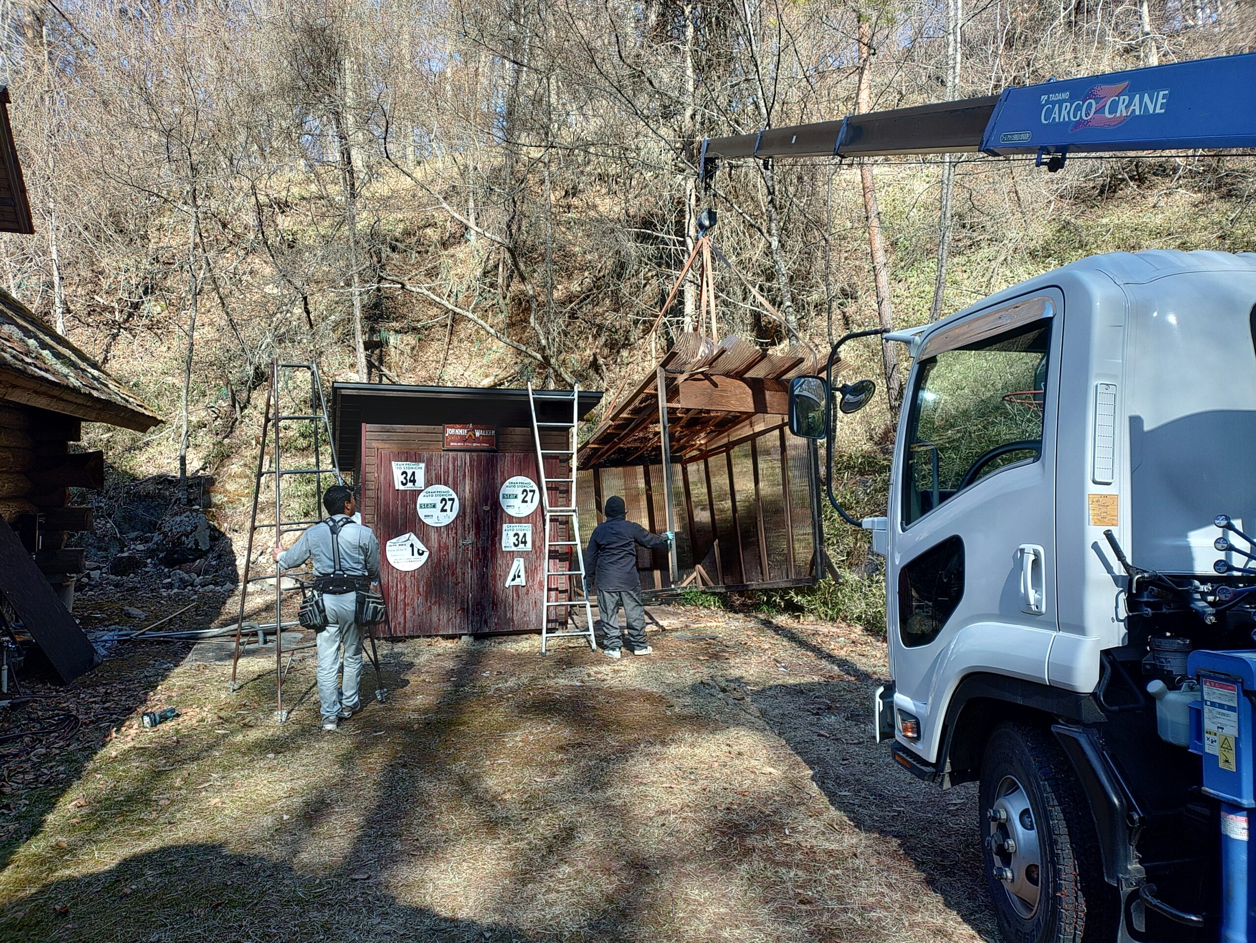 クレーン車で既存の物置小屋などを撤去、移動し来週よりコテージ工事始めます。