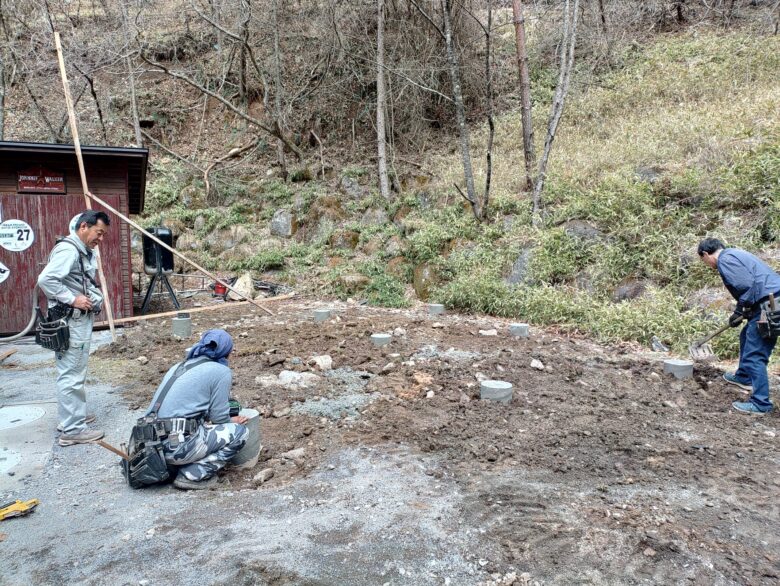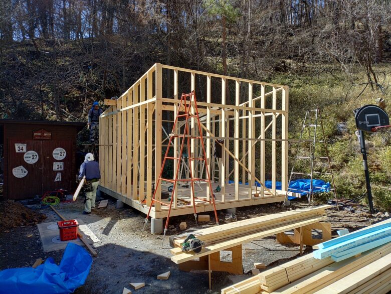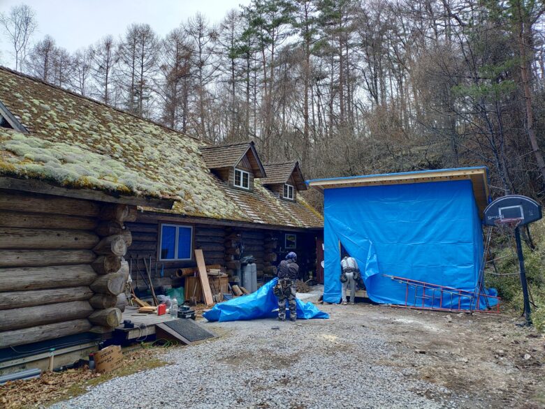 今日は明日は雨に予報なので、屋根までを完工し、明日の雨でも作業が出来るように雨養生も完璧です。
