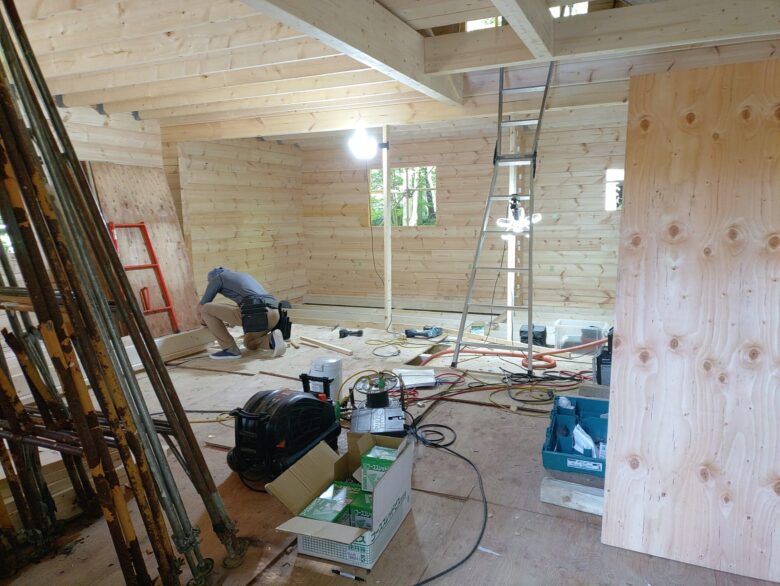本日は内装工事へと工事は進み、今日から床下地工事へと進行。